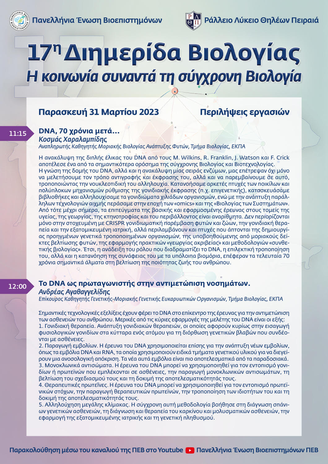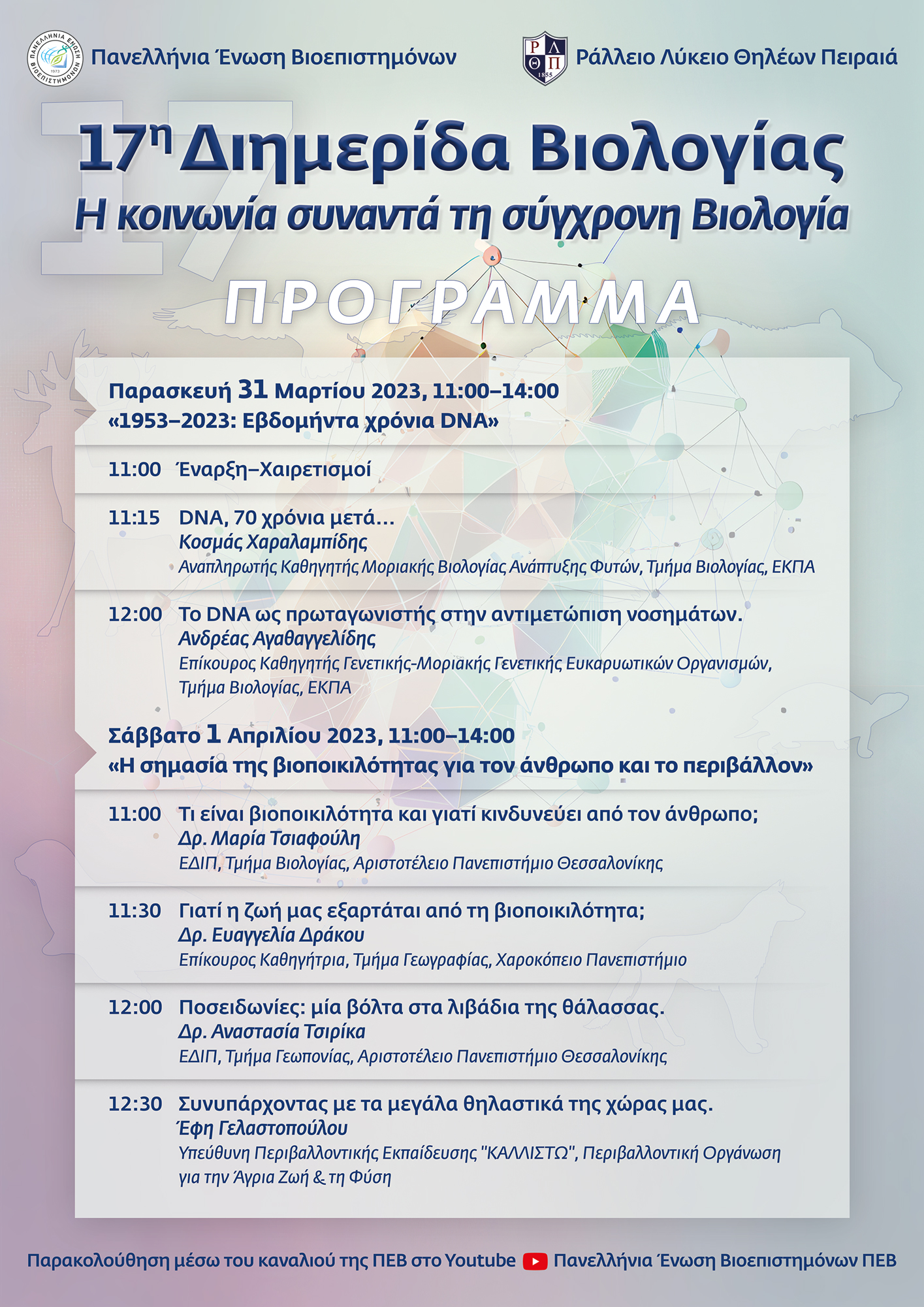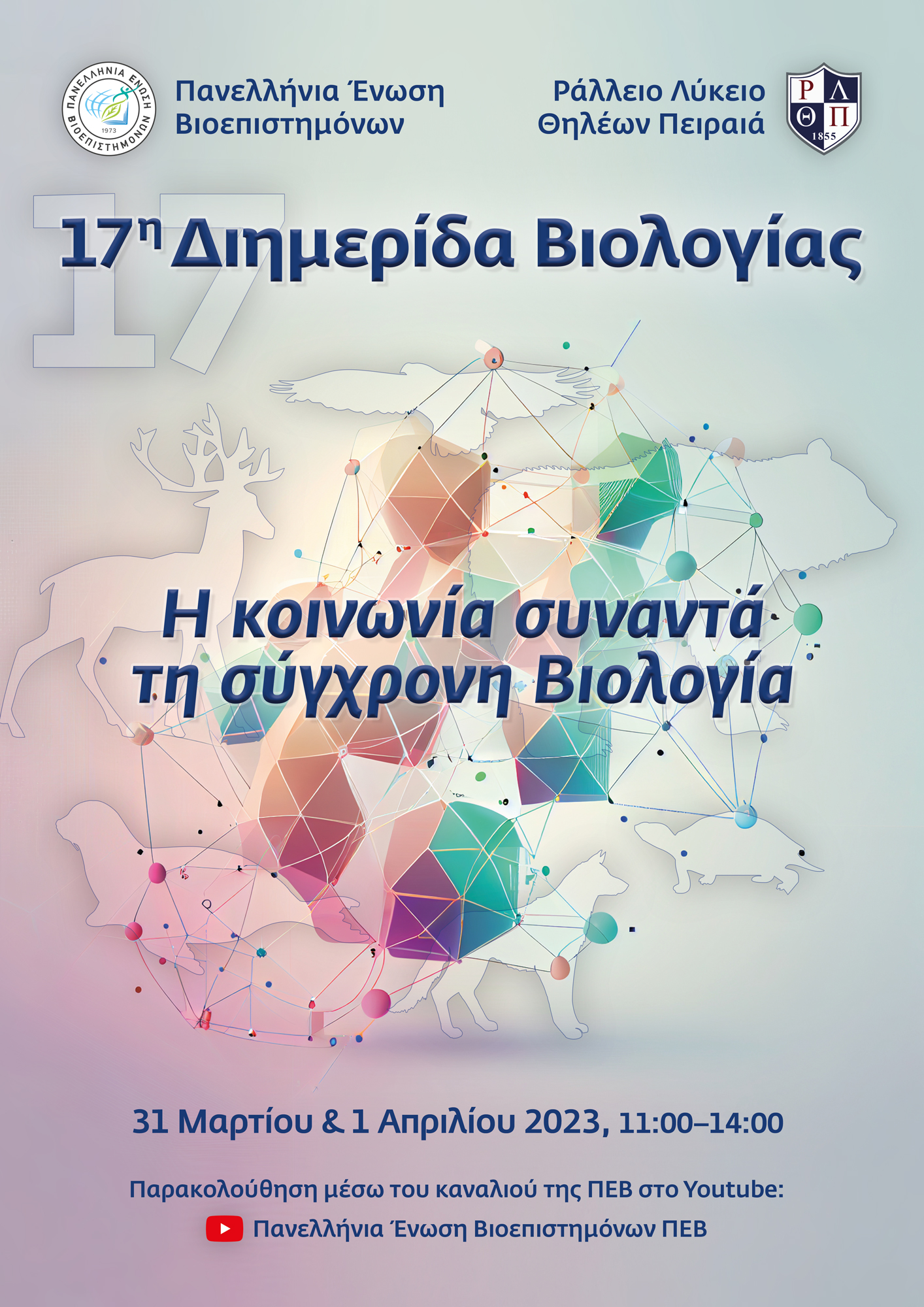 Η Πανελλήνια Ένωση Βιοεπιστημόνων και το Ράλλειο Λύκειο Θηλέων Πειραιά συνδιοργανώνουν στις 31 Μαρτίου και 1 Απριλίου 2023 για 17η συνεχή χρονιά την Διημερίδα Βιολογίας "Η κοινωνία συναντά τη σύγχρονη Βιολογία"