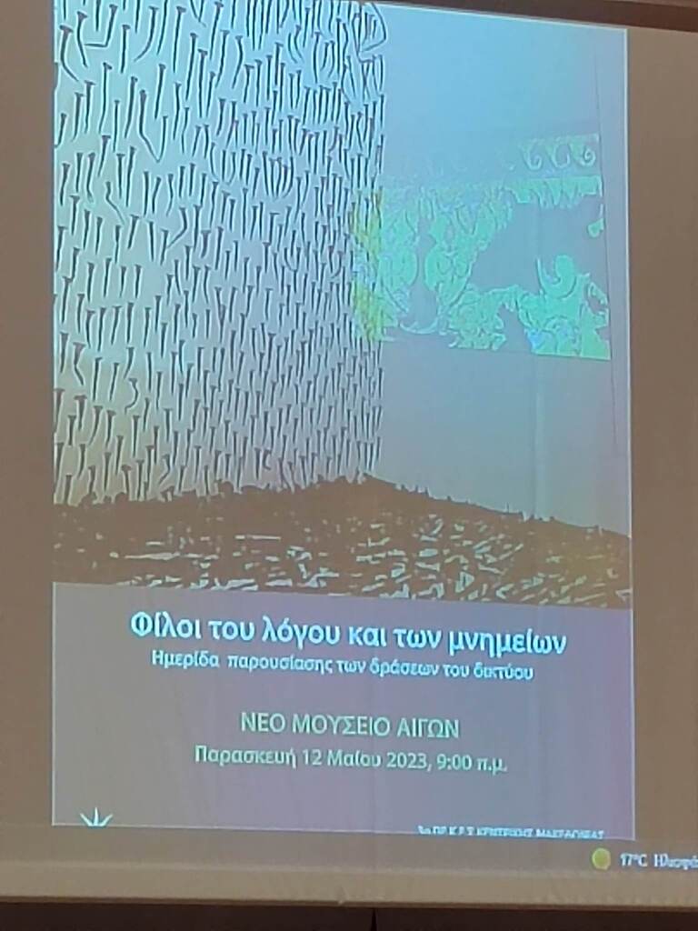 Την Παρασκευή 12 Μαίου 2023 (09:00-12:00π.μ) στο Αμφιθέατρο του Νέου Μουσείου των Αιγών, στο πλαίσιο των Δράσεων του δικτύου «Φίλοι του λόγου και των μουσείων» που έχει συσταθεί από τον Σύμβουλο Εκπαίδευσης Φιλολόγων κ.Περπερίδη Παύλο της ΔΔΕ Ημαθίας σε συνεργασία με την Εφορία Αρχαιοτήτων Ημαθίας και τον Σύνδεσμο Φιλολόγων Ημαθίας πραγματοποιήθηκε Ημερίδα με θέμα «Παρουσίαση Δράσεων του Δικτύου».