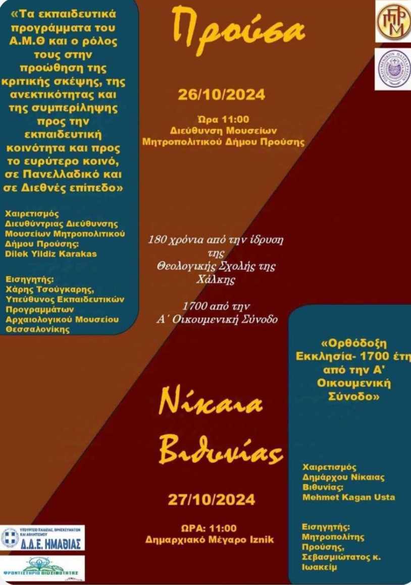 Ανακοινώνουμε το πρόγραμμα των ημερίδων που θα πραγματοποιηθούν στο πλαίσιο της εκπαιδευτικής δράσης σε Κωνσταντινούπολη-Χάλκη-Προύσα που συνδιοργανώνει η Δ.Δ.Ε. Ημαθίας με το Πατριαρχικό Ίδρυμα Πατερικών Μελετών και άλλους φορείς.