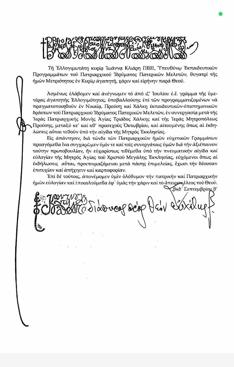 Επιστολή που απηύθυνε με τις Πατρικές ευχές Του η Αυτού Θειοτάτη Παναγιότης Αρχιεπίσκοπος Κωνσταντινουπόλεως, Νέας Ρώμης και Οικουμενικός Πατριάρχης κ.κ. Βαρθολομαίος, ενόψει της εκπαιδευτικής επίσκεψης που συνδιοργανώνει η Δ.Δ.Ε. Ημαθίας.