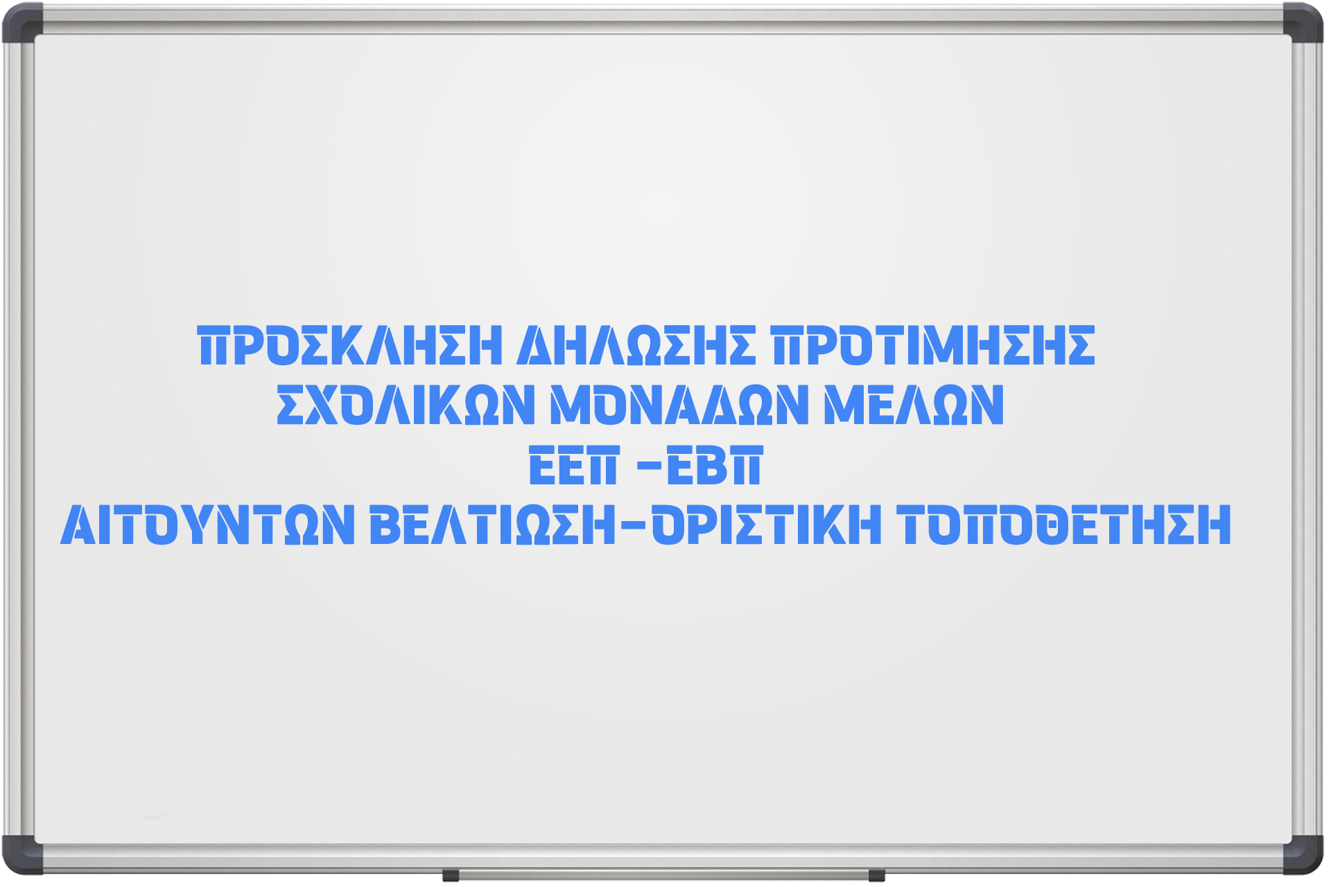 Δημοσιεύτηκε: 20 Δεκεμβρίου 2022 Ανακοίνωση Οριστικών Πινάκων Μοριοδότησης Μελών Ε.Ε.Π.-Ε.Β.Π. αιτούμενων μετάθεση από Περιοχή σε Περιοχή και Βελτίωση-Οριστική Τοποθέτηση